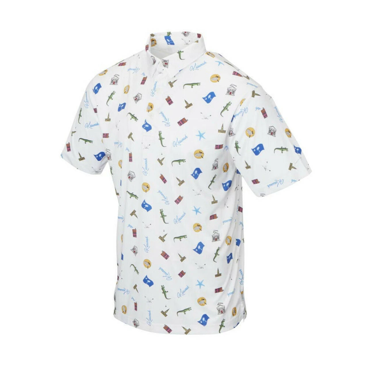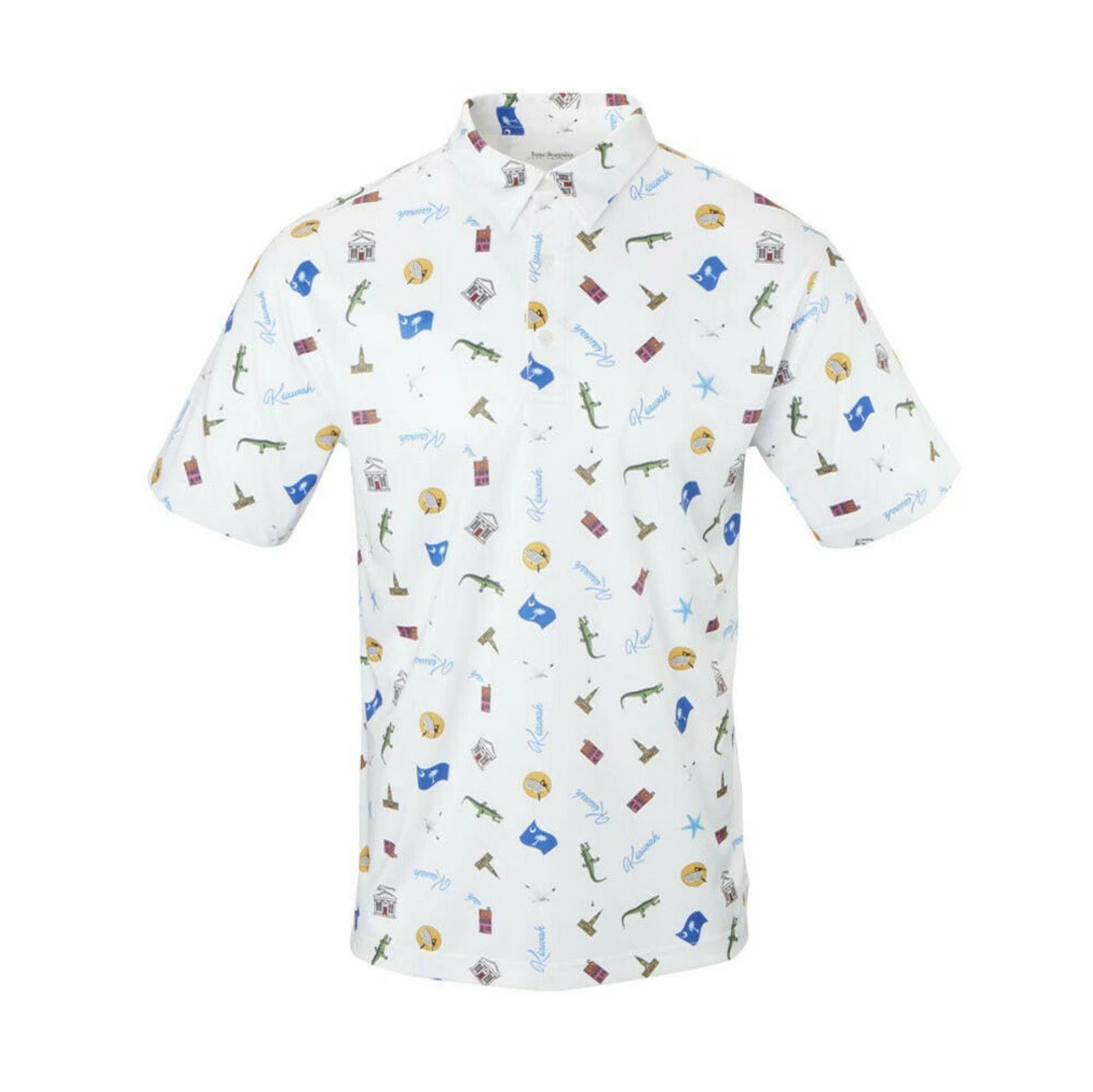 Backspin Kiawah Polo pays homage to the world famous golf course with bold and fun designs throughout. The stretch fabric polo features a triple button placket and self collar for a classic look and timeless style.